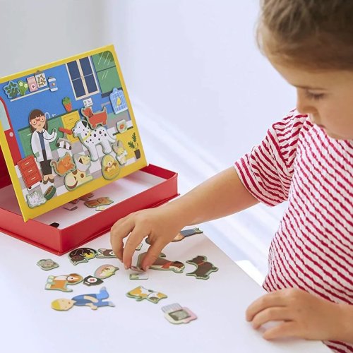 Tato přenosná sada her obsahuje 50 magnetických dílků a dvě magnetické tabulky, z nichž si můžete vybrat. Lze použít jako divadélko. Magnetickou scénku lze postavit díky zarážkám v krabici. Tvořte vlastní příběhy, starejte se o čivavu, nakrmte ryby, pečujte o kočku, nemocné zvířátko vemte k veterináři, vytvořte nekonečné kombinace scén. Praktická skládácí krabička, která napomáhá rychlému uklizení dílků a uložení na poličku. Robustní konstrukce je vyrobena tak, aby měla dlouhou životnost. Hlavní vlastnosti: 50 magnetických dílků 2 magnetické tabulkyZ recyklovaných materiálů potištěných rostlinnými inkousty