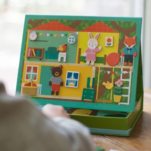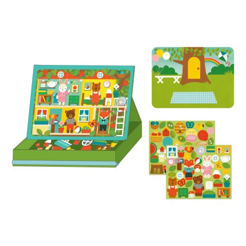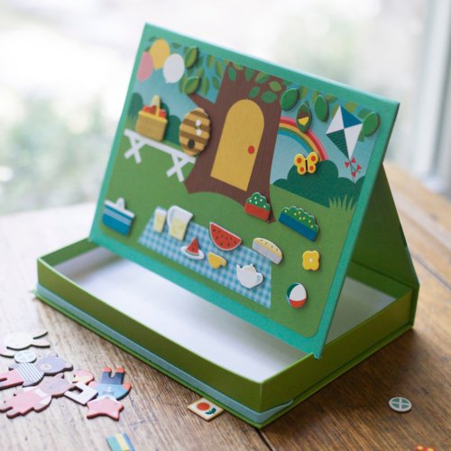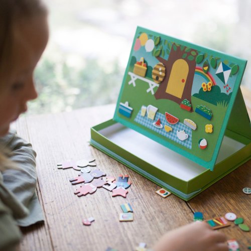 Dekorujte svůj zvířecí domeček nebo vytvořte roztomilý piknik pro zvířata v parku. Tento přenosný hrací set lze použít jako divadélko. Má dvě pozadí, z kterých si můžete vybrat, a také přes 72 magnetických dílků. Magnetickou scénku lze postavit díky zarážkám v krabici. Krabice ve stylu stojanu obsahuje elastickou gumičku, kterou můžete použít pro rychlý úklid. Kreativní hračka s nekonečnými možnostmi kombinací a scén. Pro děti od 3 let věku. Hlavní vlastnosti: 72 magnetických dílků 2 magnetické tabulkyPevná konstrukceZ recyklovaných materiálů potištěných rostlinnými inkoustySplňuje všechny bezpečnostní normy