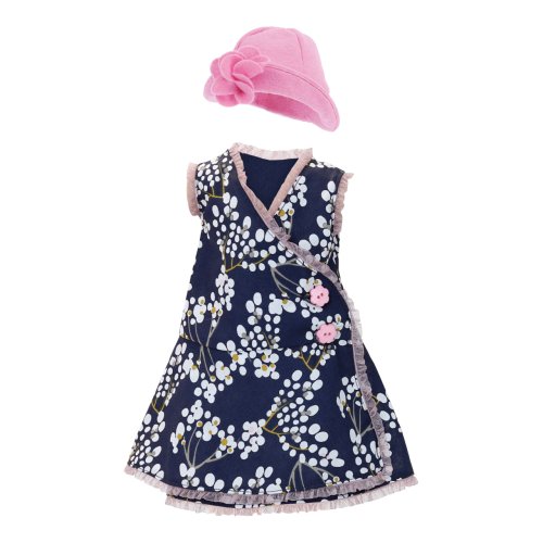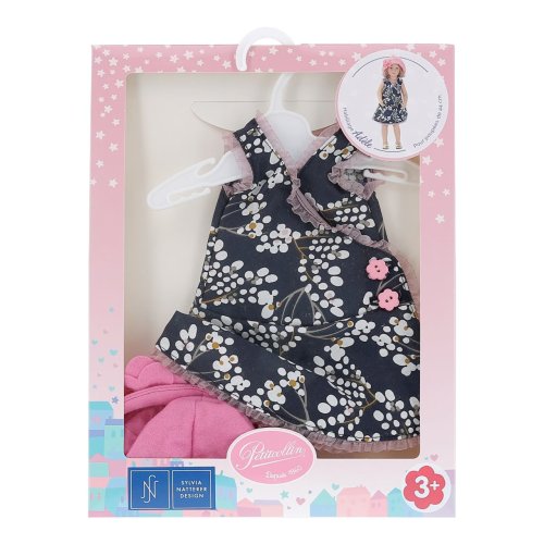 Obleček určený zejména pro panenky Petitcollin řady Starlette. Skládá se z tmavě modrých vzorovaných šatiček a růžového kloboučku. Oblečky Petitcollin jsou pečlivě zpracované, vynikají francouzskou elegancí, jedinečnou barevností a vzory, díky kterým jsou poutavé a nezaměnitelné. Dodáváno v papírové krabičce s průhledem a plastovým ramínkem. Hlavní vlastnosti:pro panenky o výšce 44 cmšatičky a kloboučekvyrobeno ve Francii