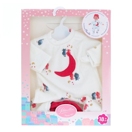Obleček určený zejména pro panenky Petitcollin řady Petit Câlin odpovídající velikosti. Skládá se z bílého pyžámka s potiskem a červené čepičky. Oblečky Petitcollin jsou pečlivě zpracované, vynikají francouzskou elegancí, jedinečnou barevností a vzory, díky kterým jsou poutavé a nezaměnitelné. Dodáváno v papírové krabičce s průhledem a plastovým ramínkem. Hlavní vlastnosti:pro panenky o výšce 36 cmpyžámko a čepičkavyrobeno v Tunisku