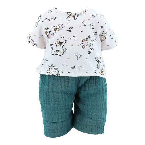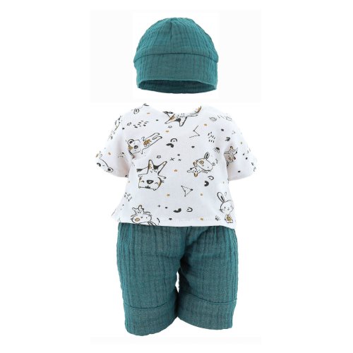 Obleček určený zejména pro panenky Petitcollin řady Petit Câlin odpovídající velikosti. Skládá se z bílého trička s potiskem, krátkých modrozelených kalhot a čepičky stejné barvy. Oblečky Petitcollin jsou pečlivě zpracované, vynikají francouzskou elegancí, jedinečnou barevností a vzory, díky kterým jsou poutavé a nezaměnitelné. Dodáváno v papírové krabičce s průhledem a plastovým ramínkem. Hlavní vlastnosti:pro panenky o výšce 36 cmtričko, krátké kalhoty a čepičkavyrobeno v Tunisku