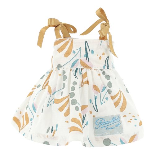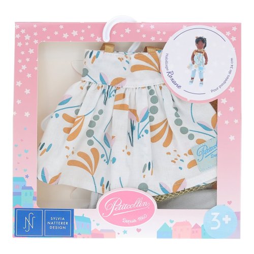 Obleček určený zejména pro panenky Petitcollin řady Minouche. Skládá se z bílých vzorovaných šatů s ramínky, světle šedých legín a síťovaného zlatého šátku. Oblečky Petitcollin jsou pečlivě zpracované, vynikají francouzskou elegancí, jedinečnou barevností a vzory, díky kterým jsou poutavé a nezaměnitelné. Dodáváno v papírové krabičce s průhledem a plastovým ramínkem. Hlavní vlastnosti:pro panenky o výšce 34 cmšatičky, legíny a šátekvyrobeno v Tunisku