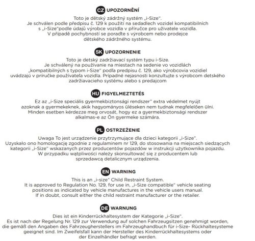 UPOZORNĚNÍ Toto je dětský zádržný systém „i-Size“. Je schválen podle předpisu č. 129 k použití na sedadlech vozidel kompatibilních s „i-Size“ podle údajů výrobce vozidla v příručce pro uživatele vozidla. V případě pochybností se poraďte s výrobcem nebo prodejcem dětského zádržného systému.