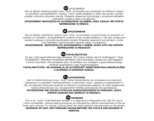 UPOZORNĚNÍ Toto je dětský zádržný systém typu i-Size. Je schválen pro používání na místech k sezení ve vozidlech kompatibilních s typem i-Size, 129, jak výrobci vozidel uvádějí v příručce uživatele vozidla. Případně nejasnosti konzultujte s výrobcem dětského zádržného systému nebo s prodejcem. UPOZORNĚNÍ! NEPOUŽÍVEJTE AUTOSEDAČKU VE SMĚRU JÍZDY, DOKUD VĚD DÍTĚTE NEPŘESÁHNE 15 MĚSÍCŮ!