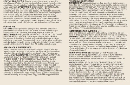 UPOZORNĚNÍ Přebalovací tašku nepřetěžujte, mohly by dojít k převrácení kočárku! Nikdy nenechávejte dítě v kočárku bez dozoru. Při nakládání tašek na kočárek dbejte na správné rozložení hmotnosti. Tento výrobek není hračka. Vždy používejte pod dohledem dospělé osoby. Uschovejte balení pro budoucí potřeby. Udržujte mimo dosah dětí. Pokud zjistíte opotřebování nebo poškození výrobku, nepoužívejte jej. Chraňte před ohněm. Plastový obal zničte nebo udržujte mimo dosah dětí, protože může dojít k udušení.