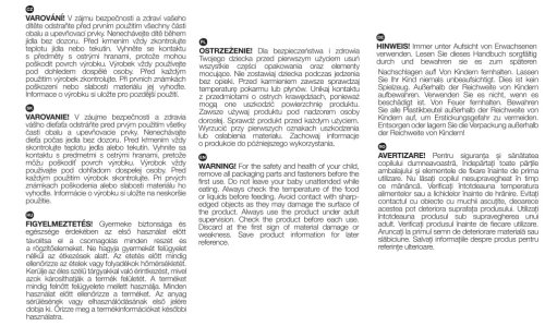 UPOZORNĚNÍ V zájmu bezpečnosti a zdraví vašeho dítěte odstraňte před prvním použitím všechny části obalu a upevňovací prvky. Nenechávejte dítě během jídla bez dozoru. Před krmením vždy zkontrolujte teplotu jídla nebo tekutin. Vyhněte se kontaktu s předměty a ostrými hranami, protože mohou poškodit povrch výrobku. Výrobek vždy používejte pod dohledem dospělé osoby. Před každým použitím výrobek zkontrolujte. Při prvních známkách poškození nebo slabosti materiálu jej vyhoďte. Informace o výrobku si uložte pro pozdější použití.