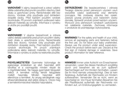 UPOZORNĚNÍ V zájmu bezpečnosti a zdraví vašeho dítěte odstraňte před prvním použitím všechny části obalu a upevňovací prvky. Nenechávejte dítě bez dozoru. Výrobek vždy používejte pod dohledem dospělé osoby. Před každým použitím výrobek zkontrolujte. Při prvních známkách poškození nebo slabosti materiálu jej vyhoďte. Informace o výrobku si uložte na pozdější použití.