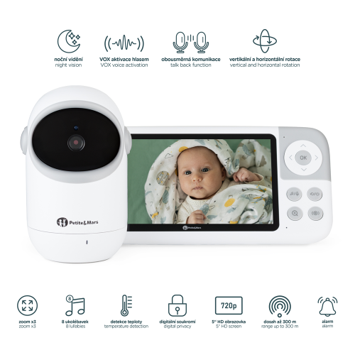 Chůvička je vybavena kamerou s možností dálkového ovládání, takže máte obraz neustále pod kontrolou – ať se dítě pohne kamkoliv. Systém lze rozšířit až na 4 kamery, což z něj činí ideální řešení pro více místností nebo více dětí. Funkce alarmu slouží jako časovač či připomínka – například na krmení, přebalení nebo kontrolu miminka. Navíc tato dětská chůvička nabízí mnoho funkcí, které usnadňují každodenní péči.