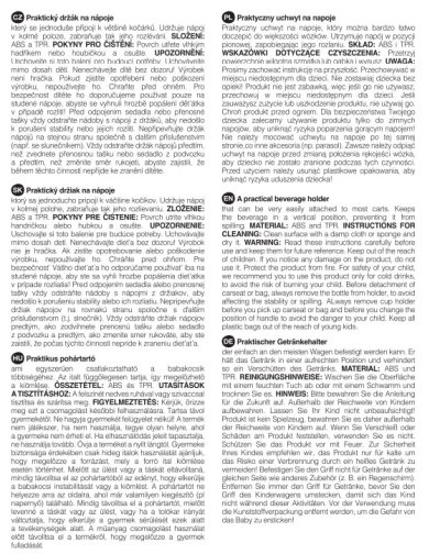 UPOZORNĚNÍ Uschovejte si balení pro budoucí potřeby. Uchovávejte mimo dosah dětí! Nikdy nenechávejte dítě bez dozoru! Výrobek není hračka. Pokud zjistíte opotřebování nebo poškození výrobku, nepoužívejte jej. Chraňte před ohněm. Pro bezpečnost Vašeho dítěte jej doporučujeme pouze na studené nápoje, abyste se vyhnuli hrozbě popálení dítěte v případě rozlití! Před odpojením sedadla nebo přenosné tašky vždy odstraňte nádoby s nápoji z držáků, aby nedošlo k doporučení stability nebo jejich rozlití. Nepřipevňujte držák na nápoje na stejnou stranu společně s dalším příslušenstvím. Vždy odstraňte držák nápojů předtím, než zvednete přenosnou tašku nebo sedátko z podvozku a předtím, než změníte směr rukojeti, abyste zajistili, že během těchto činností nedojde ke zranění dítěte.