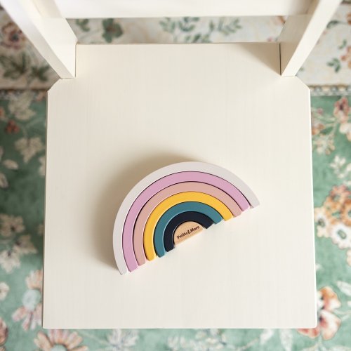 Dřevěná skládací hračka STARDUST ve tvaru duhy bude rozvíjet motorické dovednosti, schopnost rozpoznávat tvary a barvy a stimulovat vizuální a prostorovou představivost.