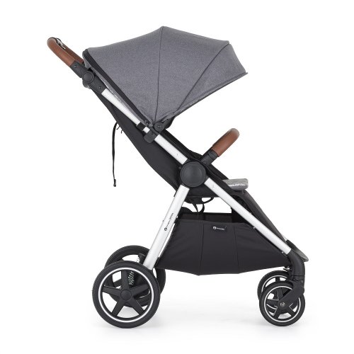 - Konstrukci kočárku ve stříbrné barvě s madlem a rukojetí v hnědé eko-kůži