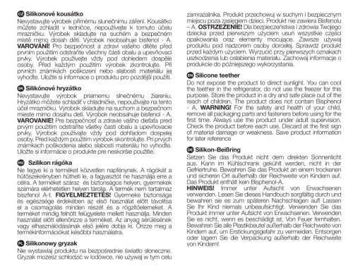 Vlastnosti: • měkké, lehké a pružné, • vyrobeno ze 100% bezpečného potravinářského silikonu bez obsahu BPA, • má uklidňující účinek na dásně děťátka během prořezávání zoubků, • ergonomický design, tvarovaný s ohledem na nejmenší: malé rozměry usnadňují uchopení a hraní, • různorodý povrch pro stimulaci dobrého vývoje čelisti, • bezpečný tvar, zabraňující udušení, • rozvíjí motorické schopnosti dítěte, • lze chladit v chladničce (ne v mrazničce) • snadno se udržuje v čistotě, lze jej mýt v myčce nádobí, • rozměry: 9,5 x 12 cm, • hmotnost: 42 g."