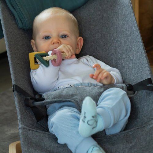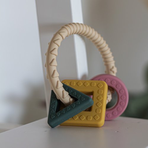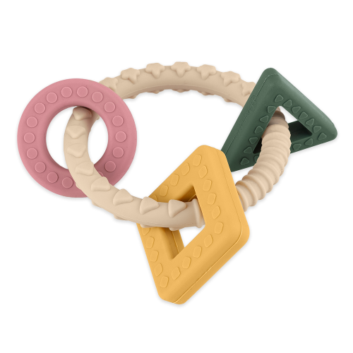 Silikonové kousátko FIGURES, které se skládá z kroužku s výstupky, na nichž jsou geometrické tvary, umožňuje dítěti objevovat svět nových pocitů. Je nejen zdrojem zábavy, ale také nástrojem, který stimuluje vývoj. Různé tvary a textury nabízejí vašemu dítěti zajímavé hmatové vjemy, pomáhají zkoumat hmat a korigují rozvíjející se smyslové dovednosti.
