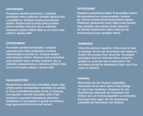 UPOZORNĚNÍ! Pravidelně výrobek kontrolujte. V případě opotřebování nebo poškození výrobek nepoužívejte a vyměňte jej. Výrobek chraňte před přímým ohněm. Plastový obal je třeba před použitím tohoto výrobku odstranit, aby se zabránilo nebezpečí udušení dítěte! Obal se má zničit nebo odložit z dosahu dětí!