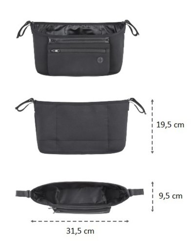 Dvě boční přihrádky uskladní láhev, termosku nebo hrnek s kávou. Do velké prostřední přihrádky snadno umístěte vše co potřebujete během procházky či výletu. Přední odnímatelnou kapsu můžete používat i samostatně. Je vhodná pro uskladnění mobilu a obsahuje také port pro sluchátka, takže během kočárkování můžete poslouchat svou oblíbenou hudbu, případně telefonovat. Pokud si uděláte zastávku na dětském hřišti, jednoduše odzipujete kapsu s mobilem a jinými cennostmi a vezmete si ji s sebou.