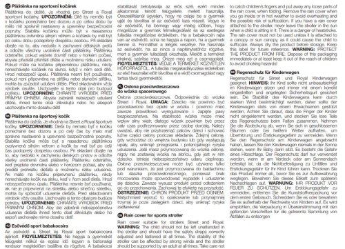 UPOZORNĚNÍ! Dítě by nemělo být v kočárku ponecháno bez dozoru a po celou dobu by mělo mít správně seřízené a upevněné bezpečnostní popruhy. Stabilita kočárku může být s nasazenou pláštěnkou ovlivněna silným větrem a kočárek by měl být po celou dobu podepřen dospělou osobou. Při skládání dbejte na to, aby nedošlo k zachycení dětských prstů a odložte všechny uvolněné části pláštěnky. Pláštěnku odstraňte, když přejdete dovnitř nebo v horkém počasí, abyste předešli přehřátí dítěte a možnému riziku udušení. Máte-li na kočárku připevněno pláštěnku, nikdy nenechávejte kočárek na slunci, když v něm sedí dítě. Hrozí nebezpečí úpalu. Pláštěnka nesmí být používána pokud není připevněna na stříšku nebo sluneční stříšku, mohla by způsobit udušení dítěte. Před skladováním výrobek vždy osušte. UPOZORNĚNÍ: chraňte výrobek před přímým ohněm. Abyste zabránili nebezpečí udušení dítěte ihned tento obal zlikvidujte nebo jej alespoň uschovejte mimo dosah dětí.
