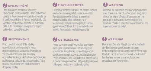 UPOZORNĚNÍ! Před použitím odstraňte všechny upevňovací prvky a obaly. Hrozí nebezpečí udušení. Pravidelně výrobek kontrolujte pro známky opotřebení. Pokud je jakákoli část výrobku poškozena, odložte ji z dosahu dětí. Tuto hračku používejte pouze pod dohledem dospělé osoby.