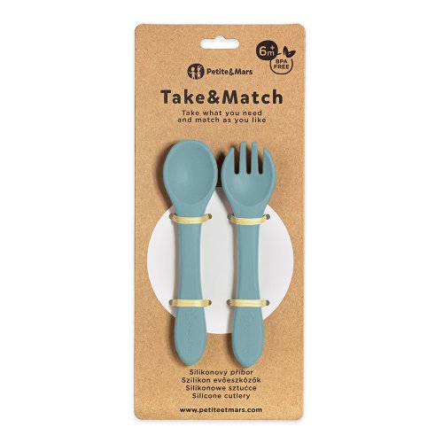TAKE&MATCH série TAKE what you need and MATCH as you like. Vyberte si výrobky, které vaše dítě potřebuje, a slaďte je barevně podle svých představ. Jídelní sety jsou k dispozici v barvách inspirovaných nejnovějšími trendy a zkomponovány tak, aby každá barva dokonale ladila s ostatními. Můžete proto libovolně kombinovat všechny prvky potřebné k přípravě bezpečného jídla pro vaše dítě a vytvořit si tak vlastní jedinečnou kolekci. Díky naší sérii se krmení vašeho dítěte stane nejen velmi jednoduchým, ale také estetickým a příjemným. Silikonový příbor TAKE&MATCH Souprava sestávající z vidličky a lžičky je celá vyrobena z potravinářského silikonu bez obsahu BPA. Díky tomu může vaše dítě jíst příborem teplá i studená jídla. Díky pružnému silikonu je příbor ideální pro citlivé dásně malého dítěte. Příbor je vhodný pro děti od 6 měsíců, které se seznamují s pestrou stravou, a pro ty, které se již úspěšně učí jíst samy. Zaoblené tvary a malé rozměry usnadňují děťátku jejich uchopení a tím i papání. Příbor lze sladit s jiným výrobkem z řady TAKE&MATCH ve stejné nebo hodící se barvě.