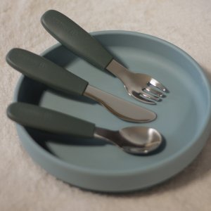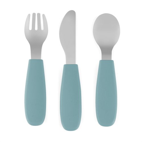 Funkční části jsou vyrobeny z vysoce kvalitní nerezové oceli, zatímco ergonomické rukojeti jsou potaženy měkkým silikonem vhodným pro styk s potravinami, přizpůsobeným malým dětským ručičkám. Díky tomu je úchop pohodlný a bezpečný, což pomáhá rozvíjet správné návyky při jídle.