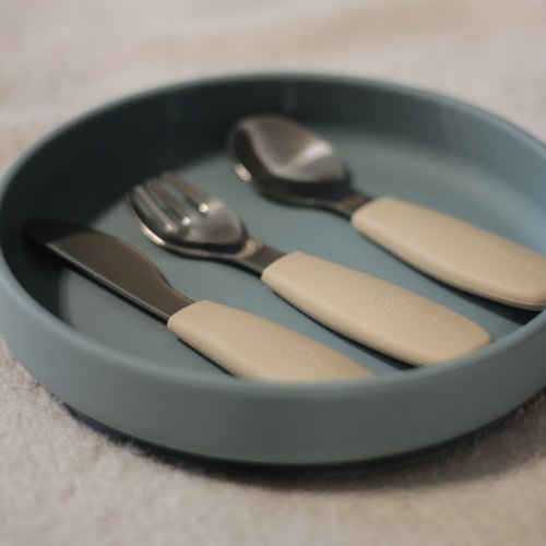 Funkční části jsou vyrobeny z vysoce kvalitní nerezové oceli, zatímco ergonomické rukojeti jsou potaženy měkkým silikonem vhodným pro styk s potravinami, přizpůsobeným malým dětským ručičkám. Díky tomu je úchop pohodlný a bezpečný, což pomáhá rozvíjet správné návyky při jídle.