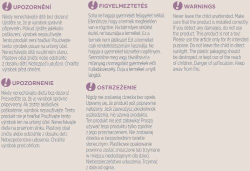 UPOZORNĚNÍ! Nikdy nenechávejte dítě bez dozoru! Přesvědčte se, že je výrobek správně připevněn. Pokud zjistíte jakékoli poškození, výrobek nepoužívejte. Tento produkt není hračka! Používejte tento výrobek pouze k určenému účelu. Nenechávejte dítě na přímém slunci. Plastový obal zničte nebo odstraňte z dosahu dětí. Nebezpečí udušení. Chraňte před ohněm.