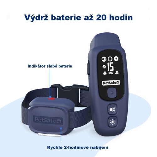 Rychlonabíjecí baterie PetSafe® Pro Trainer se nabíjí 2 hodiny a vydrží až 20 hodin. Když je potřeba obojek nabít, indikátor slabé baterie se rozbliká na obojku i dálkovém ovladači.
