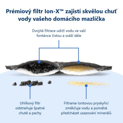 Filtry Ion-X™ pro fontánky PetSafe® jsou odborně vytvořeny tak, aby zajistily, že voda Vašeho domácího mazlíčka zůstane čistá a svěží, což přispívá k jeho celkovému zdraví. Unikátní duální filtrační systém kombinuje sílu aktivního uhlí a iontoměničových filtrů. Uhlíkový filtr důsledně odstraňuje všechny špatné chutě a pachy, zatímco iontový filtr udržuje vodu měkkou, čímž zabraňuje usazování minerálů. Tyto filtry jsou speciálně navrženy pro fontánky PetSafe® Outlast™ a Viva™ a poskytují perfektní přizpůsobení a snadnou údržbu. Filtry jsou navrženy pro jednoduchý proces výměny.