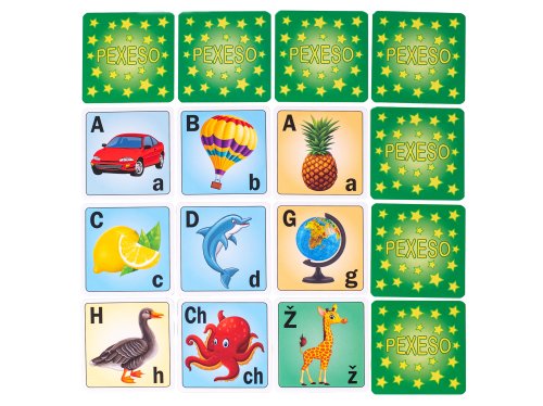 Společenská hra, při které si děti hravou formou trénují svou paměť. Hra se po rozstříhání skládá z 32 obrázkových dvojic. Pexeso 32 dvojic s obrázky písmen Abecedy.
