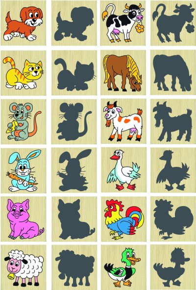 Pexeso z 24 dřevěných kamenů o rozměrech 40x40x6 mm s potiskem zvířátek a jejich stínů.