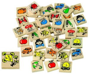 Pexeso z dřevěných kamenů o rozměrech 40x40x10 mm s potiskem obrázků.