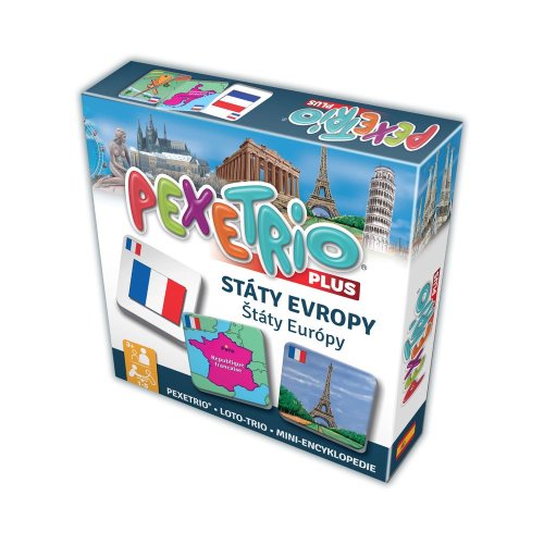 Nové provedení oblíbené společenské hry PEXETRIO. Pevnější krabička a kartičky zhotovené z tvrdého kartonu a se zaoblenými rohy. Tato hra procvičí nejen paměť, ale i znalosti! Kdo k sobě správně přiřadí vlajku, mapku a stavební památku stejného státu? Při hře otáčej tři kartičky a hledej trojice, které patří k sobě! Každá trojice kartiček je opatřena stejným identifikačním znakem. Každá hra obsahuje návod a legendu k danému tématu. Hráč, který najde nejvíc trojic, vyhrává. Tyto společenské hry jsou velmi oblíbené i jako didaktické pomůcky. Nevhodné pro děti do tří let (nebezpečí spolknutí malých částí).