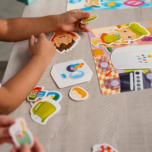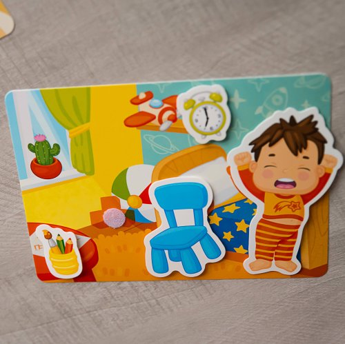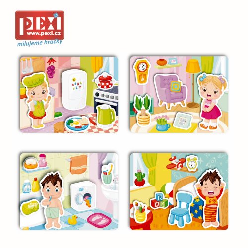 Trénujte koordinaci ruka - oko, jemné motorické dovednosti a poznejte deatily svého kařdodenního života. Vybavte si vlastní domácnost! Kam patří hrnec - do kuchyně nebo do vany? A kde si má chlapec vyčistit zuby? Najděte správné odpovědi a rozmístěte předměty na jich místa v každé místnosti. Co je uvnitř?Sada obsahuje 4 pružných velkých plastových destiček se suchým zipem a 20 samostatných dílků, které umístíte na destičky pomocí suchého zipu. Díky této vychytávce jednotlivé díly jen tak nespadnou a budou držet na správném místě. Všechny části jsou vyrobené z odolného, ale tenkého plastu se speciální povrchovou úpravou, která je dětem příjemná na dotek. Jak hrát? Berte jednotlivé dílky jeden po druhém a povídejte dětem co na nich je.Potom vezměte destičku s obrysy předmětů a vybídněte dítě, aby našlo správný předmět pro každý obrys a připevnilo ho pomocí suchého zipu na správné místo. Hlavní vlastnosti: zlepšuje motorické schopnosti trénuje vyjadřování a mluvenou řeč rozvíjí myšlení a paměť upevňuje udržení pozornosti