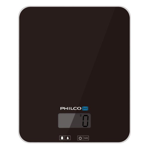 Digitální kuchyňská váha Philco PHKS4511 v čistém minimalistickém designu s přehledným modře podsvíceným displejem.