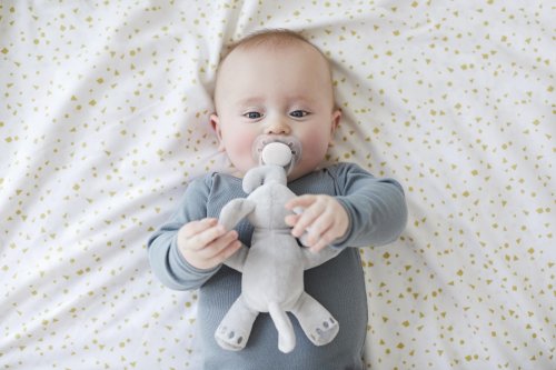 Plyšová hračka pomáhá udržovat dudlík v ústech dítěte a usnadňuje jeho nalezení dítěti i rodičům.