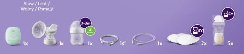 Co je součástí: Sáčky na mléko: 5 ks, Motorová jednotka, Silikonová hadička, Kabel USB-C, Lahev Natural (125 ml), Sada pro odsávání, Šroubovací víčko, Uzavírací destička: 1 ks, Dudlík s pomalým průtokem: 1 ks, Prsní vložky: 4 ks
