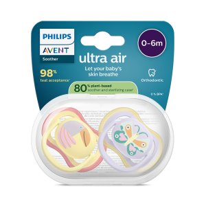 Umožňuje pokožce vašeho děťátka dýchat Mimořádně velké vzduchové otvory umožňují pohodlnější zklidnění Zklidňuje a umožňuje dýchání díky velkým vzduchovým otvorům. 9 z 10 rodičů souhlasí, že šidítka Philips Avent Ultra Air jsou pro děťátko pohodlná.** Zklidňující úleva je vždy po ruce, ať se o miminko právě stará kdokoli. Nyní z 80 % z rostlinných materiálů.* Vytvořeno pro pohodlí • Velmi velké ventilačními otvory umožňují pokožce dítěte dýchat • Ortodontický dudlík pro přirozený vývoj zubů a dásní • Oblíbené u miminek, 98% úspěšnost přijetí šidítka*** Velmi velké ventilační otvory Otvory v kotouči kolem šidítka umožňují pokožce vašeho dítěte dýchat a udržují ji sušší pro maximální pohodlí. Ortodontický silikonový sosák Naše ortodontické dudlíky jsou navrženy z měkkého silikonu, který podporuje přirozené pohyby ústních svalů a pomáhá snižovat riziko vadného skusu. Úzký krček dudlíku je navržen tak, aby snižoval tlak mezi jazykem a patrem. Šidítka Philips Avent Ultra jsou nezávisle akreditovány Nadací pro zdraví ústní dutiny (Oral Health Foundation). Jsou vyrobeny ze 100 % z potravinářského silikonu, jsou odolnější a vydrží déle než gumové (latexové) dudlíky. Neobsahují BPA, BPS, ftaláty, PVC polycyklické aromatické uhlovodíky. 98% úspěšnost přijetí šidítka Náš texturovaný silikonový sosák je navržen tak, aby napodoboval pocit maminčina prsu. Když jsme se rodičů zeptali, jak jejich děti na naše šidítka reagují, v průměru 98 % z nich odpovědělo, že jejich miminko šidítka Philips Avent Ultra přijímá. 80 % rostlinných materiálů* Udržitelnější volby vám umožňují poskytovat nejlepší péči s menším dopadem na planetu. Kompletní řada Philips Avent ultra zahrnuje savičky a sterilizační pouzdra vyrobené z 80 % rostlinných materiálů.* Sterilizační a přenosné pouzdro Přenosné pouzdro slouží zároveň jako sterilizátor, takže dudlíky jsou vždy připravené, když je potřebujete. Stačí přidat vodu a 3 minuty zahřívat v mikrovlnné troubě pro snadnou sterilizaci, přičemž se vyprodukuje až o 50 % méně emisí CO2.***