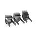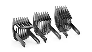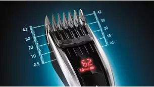 Zastřihovač se dodává se 3 nastavitelnými hřebeny na vlasy: od 1 do 7 mm, 7 až 24 mm a 24 až 42 mm. Stačí jeden z hřebenů připojit a zvolit z více než 60 nastavení s možností zajištění. Mezi jednotlivými délkami je krok přesně 0,2 mm mezi 7 a 7 mm a 1 mm mezi 7 a 42 mm. Nebo můžete zastřihovač použít bez hřebenu a vytvořit velmi krátký sestřih 0,5 mm.