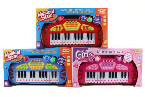 Plastové piánko. Hraje a vydává zvuky zvířátek. Napájení na 3 AA baterie (nejsou součástí balení). Rozměry piánka cca 36,5 x 20 x 3 cm. Rozměry balení cca 40 x 22 x 6,5 cm. Věk3+