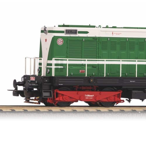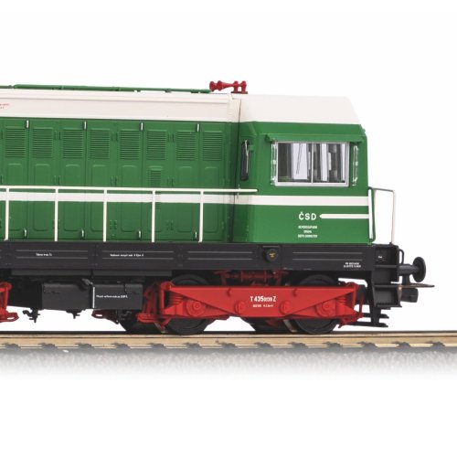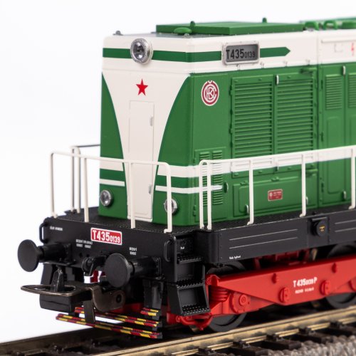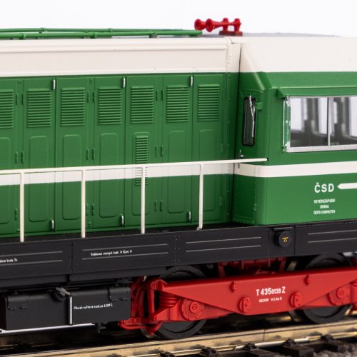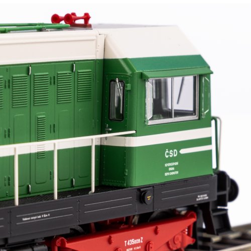 Model čtyřnápravové diesel‑elektrické lokomotivy T 435 „Hektor“ Československých státních drah, nejčastěji sloužící k posunování a pohonu lehkých nákladních souprav. Pro vysokou spolehlivost a jednoduchou obsluhu jsou tyto stroje dodnes provozovány soukromými společnostmi na vlečkách průmyslových podniků a při údržbě tratí. Díky pozornosti věnované detailům můžete obdivovat rozdílné podvozky odlišující starší a novější série lokomotivy, a to samozřejmě včetně uspořádání soustavy brzd. Precizně zpracovaná karoserie neopomíná ani nejjemnější prolisy ve dvířcích údržby, které oživují její spartánský charakter. Dojem autenticity umocňuje prvotřídní lakování pečlivě vybranými odstíny a potisk nejvyšší kvality. Dokonale čirými okénky je možno nahlížet do náležitě upraveného interiéru kabiny. Stroj zdobí řada dodatečně připojených prvků, mezi nimiž se vyjímá zejména zábradlí, ale patří k nim také podrobně zhotovený systém chlazení a elektrické vedení na střeše. Pro účely vystavení ve vitríně lze model navíc doplnit detaily táhlového ústrojí, které jsou součástí balení. Výkonný motor je vybaven rozměrnými setrvačníky a moment je přenášen prostřednictvím dvojice úhlopříčně uspořádaných bandážovaných kol na vnitřních nápravách, poháněná jsou však všechna dvojkolí. V součinnosti s těžkým, precizně navrženým a sestaveným zinkovým podvozkem je tak výsledkem vysoká tažná síla a bezvadně plynulý chod. Trojice světel na čelech se rozsvěcí a mění barvu v závislosti na směru jízdy. Osvětlením je vybavena jak kabina strojvedoucího, pak také poutavý detail v podobě provozního čísla stroje. Nejen pokročilého řízení světel lze dosáhnout vestavbou digitálního ovládání. Model je možno rozšířit zvlášť určeným digitálním dekodérem se zvukovým modulem a reproduktorem. Hlavní vlastnosti: analogové ovládánínapájení DCčtveřice nápravmotor s dvojicí setrvačníkůdvojice bandážovaných hnacích kolsvětla s přepínáním barvy dle směru jízdyosvětlení kabiny strojvedoucího a provozního číslarozhraní PluX22 dle NEM 658šachta dle NEM 362 s kinematikou krátkého spřáhla Dokumentace: brožura k BR 107/T 435 (DE)obecné informace k BR 107/T 435 (DE, EN, FR, NL)návod k obsluze a seznam náhradních dílů modelu č. 52434 (DE, EN, CZ)