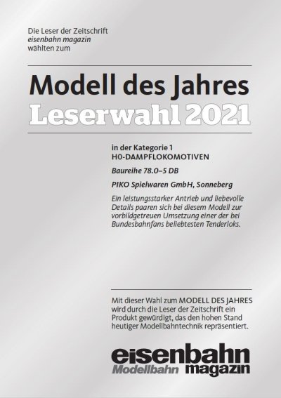 Moderní nástupce velmi oblíbené a dříve hojně rozšířené lokomotivy řady BR 78 v podobě zcela nové konstrukce z dílny PIKO a zároveň první parní lokomotiva v produktové řadě Expert. Tento model posouvá již tak vysoký standard řady Expert ještě výše. Téměř veškeré potrubí je vedeno samostatně, kabina strojvedoucího, vodní nádrže a dýmnice jsou detailně zpracovány s jemnými imitacemi nýtových hlav. Paprsky kol a parní rozvod jsou díky použitým materiálům velmi jemně provedeny. Vynikající jízdní vlastnosti zajišťuje pětipólový motor PIKO se setrvačníkem. Přídavná závaží v kotli a dva bandážované nápravové prstence zaručují vysokou tažnou sílu. Z výroby je lokomotiva vybavena dekodérem PIKO SmartDecoder s autentickými zvuky vozidla. Také kouřový generátor je již z výroby integrován. O realistickou provozní atmosféru se stará LED osvětlení závislé na směru jízdy. Brzdové hadice pro dodatečnou montáž jsou součástí balení. Specifikace: napájení DCdigitální ovládání délka s nárazníky 170 mmšachta NEM minimální rádius 422 mm2 bandážovaná koladigitální rozhraní NEM 658 PluX22vestavěný dekodér PluX22zvuk – ano, zvukový dekodér PIKO z výroby venkovní osvětlení - bílá/červená svítí v závislosti na směru jízdyfunkce páry digitálně přepínatelné osvětlení kabiny a osvětlení topeniště (s dekodérem PluX22) Hlavní vlastnosti: realistické barevné provedenídetailní zpracováníatraktivní design
