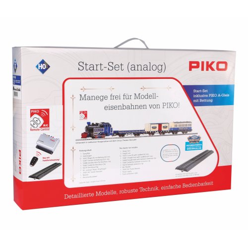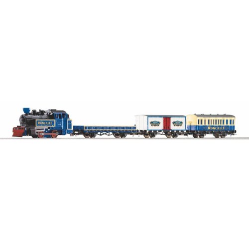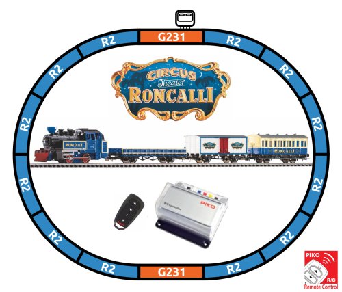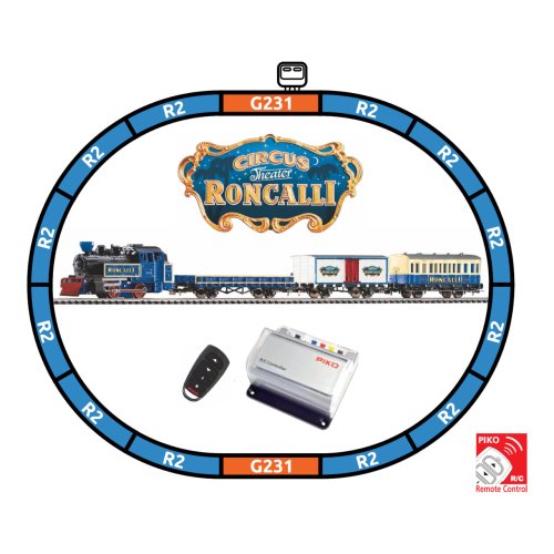 Startovací sada speciální, barevné soupravy cirkusu Roncalli skládající se z parní lokomotivy 0-4-0, jednoho osobního vozu, dvou nákladních, krytého a otevřeného, základního oválu a analogového ovládání s napájením. Lokomotiva je ovládána bezdrátově! Koleje s podložím zajišťují vyšší odolnost a životnost při opakovaném rozebírání. Nákup sady je vhodné doplnit o příslušný spotřební materiál. Plocha základny: 110x88 cmMinimální konstrukční plocha: 120x98 cm Hlavní vlastnosti: bezdrátové analogové ovládánídvojice nápravspojovací hák v nestandardní šachtěkoleje s podložím Tato sada obsahuje: parní lokomotiva (1 ks)osobní vůz (1 ks)různé nákladní vozy (2 ks)kolej oblouková R2 s podložím - 55412 (12 ks)kolej rovná G231 s podložím - 55401 (1 ks)kolej rovná G231 s podložím (přípoj pro napájecí svorku) - 55406 (1 ks)podloží pro napájecí svorku - 55447 (1 ks)napájecí svorka ke kolejím analogová - 55270 (1 ks)sada bezdrátového analogového ovladání s napájecím zdrojem (1 ks) Dokumentace: Návod k obsluze a seznam náhradních dílů soupravy č. 57142 (DE, EN, F, NL, ITA, E, POL, RUS, CHN, CZ)