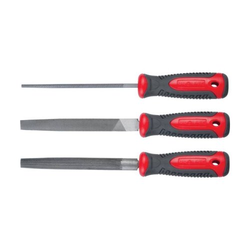 pilníky - sada 3 ks vyrobeny z tvrzené oceli (60HRC) rukojeť protiskluzová z TPR pilníky: plochý, půlkulatý, trojhranný pracovní délka: 200 mm hrubost: 2