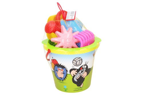 Sada na písek Krtek. Žlutá barva. Balení obsahuje kyblík 3,5 L, sítko, 2 formičky, lopatku, hrábě, konvičku.