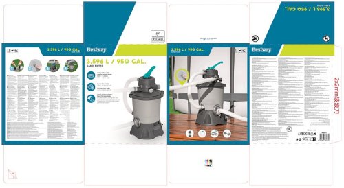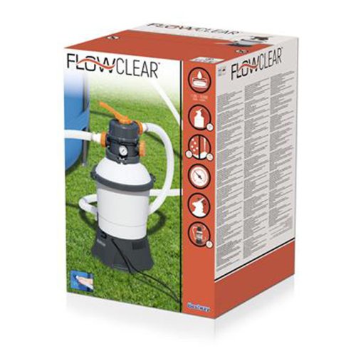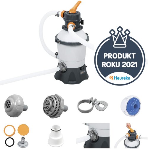 Pískové filtrační čerpadlo Bestway® 3 596 l. Písková filtrace je vysoce účinný a ekologický způsob, jak udržet čistou vodu protékající nadzemním bazénem. Je také mnohem nákladově efektivnější než provozování tradičního systému filtračního čerpadla, protože čerpadlo používá místo filtrační vložky křemičitý písek. Tam, kde je třeba vyměnit filtrační vložku každé 2 týdny, je třeba vyměnit křemičitý písek pouze jednou za 3 roky. Čerpadlo pracuje vypouštěním bazénové vody hadicí a do filtračního systému. Ačkoli voda prochází systémem s fantastickou lehkostí, křemičitý písek je tak kompaktní, že zachycuje nečistoty. Filtrovaná voda je poté čerpána samostatnou hadicí a vháněna zpět do bazénu. Písková filtrace je kompatibilní s 1 100 - 18 100 L bazény. Průtok vody čerpadlem: 3 596 l/h. Integrovaný průtok vody systémem bazénu (průtok systému): 2 271 l/h. Odolná nádrž odolná proti korozi. Šesti polohová rukojeť pro snadné přepínání funkcí filtru. Vrchní přírubová spona umožňuje otočení o 360° pro rychlou a snadnou instalaci. Dobře čitelný tlakoměr. Pro větší pohodlí se tento výrobek dodává předem sestavený. Košík předfiltru zachycuje větší nečistoty a zvyšuje tak výkon čerpadla. Pro tento výrobek se doporučuje použít hadici o průměru 3,2 cm / 1,25“ se závitem o řádné velikosti. Tento výrobek funguje s běžným konvenčním pískem nebo s naším vysoce účinným produktem Polysphere™. Písek není součástí dodávky. Potřebný rozměr písku: křemičitý písek č. 20, 0,45–0,85 mm, přibližně 8,5 kg. 220-240V~, 85W. Hmotnost produktu: 5,6 kg. Rozměry produktu: 62 x 30,6 x 30,6 cm. Rozměry balení: 43,5 x 36 x 36 cm. Hmotnost balení: 7, 47 kg.
