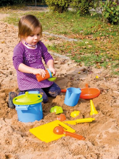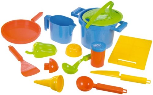 Lena Pískový set k vaření. Set k vaření se skládá ze sítko/poklička, hrnec, 3x zelenina, solnička, naběračka, obracečka, nůž, prkénko, pánev, odměrka, kornoutek, zmrzlinová naběračka. Celkem 14 dílů. Pro holky i kluky od 2 let.