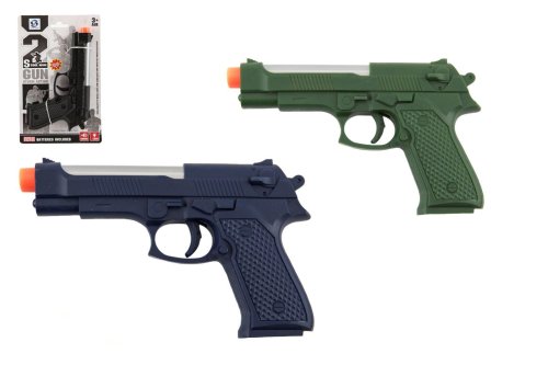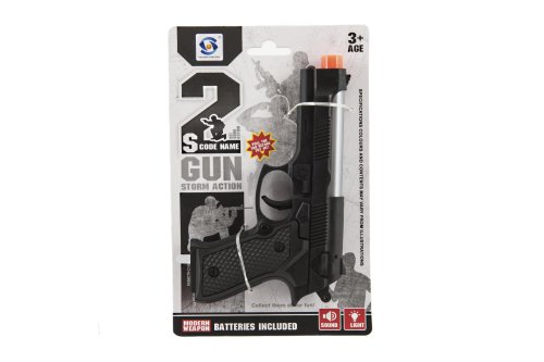 Pistole je reálně vypadající zbraň z plastu pro děti, zajisté se bude líbit všem klukům, kteří mají rádi zbraně. Po vložení baterií vydává zvuky a svítí. Baterie 2x AG10 jsou součástí výrobku. Rozměry balení 14 x 22 x 3 cm. Vhodné pro děti od 3 let.