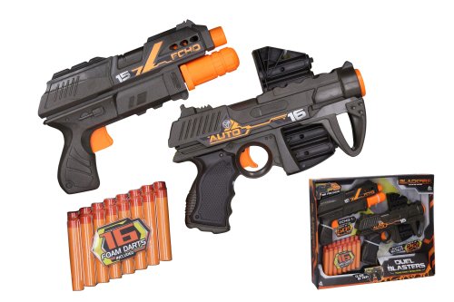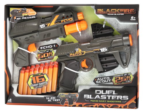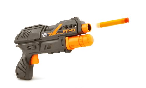 Pistole na pěnové náboje set. Balení obsahuje 2 pistole a 16 pěnových nábojů. Velikost 21 cm. Auto scout - zásobník na 6 nábojů, natažení hlavně před každým výstřelem. Výstřel stiskem spouště. Dostřel až 7,6 m. Echo-1 - Náboj se vkládá přímo do hlavně, nabíjení pumpováním (napumpovat 6x), výstřel stiskem spouště. Dostřel až 15,2 m.