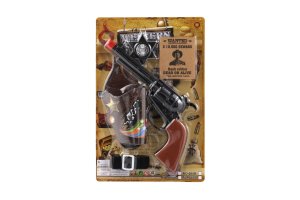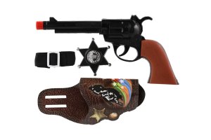 Dětská klapací pistole s doplňky je skvělým doplňkem pro hry na kovboje, šerify nebo dobrodružné příběhy z Divokého západu. Pistole je vyrobena z lehkého plastu a po stisknutí spouště vydává typický klapací zvuk, který dodává hře na autentičnosti – bez použití nábojů. Součástí balení jsou také tematické doplňky, které rozšiřují možnosti hry a podporují dětskou fantazii. Díky velikosti cca 22 cm se pistole dobře drží a je vhodná pro dětské ruce.