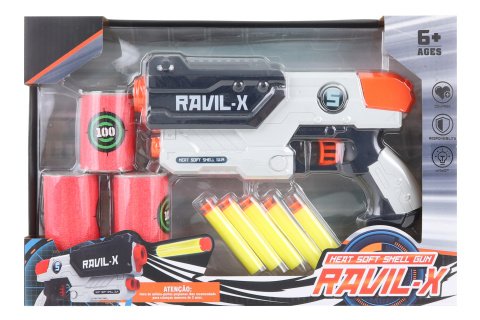 Plastová pistole na pěnové náboje. Balení obsahuje pistoli, 5 ks pěnových nábojů a 3 pěnové válce jako terče. Rozměr balení cca 33,5 x 22,5 x 6 cm. Věk 6+