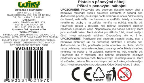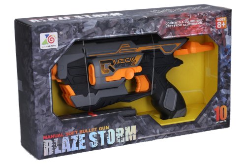 Pistole Quick s pěnovými náboji. Rozměry 28,5x7,5x16 cm. Součástí 10 pěnových nábojů (5 standardních, 5 s přísavkou). Obrázkový návod s popisem na ovládání na zadní straně obalu. Střelba vložením náboje do hlavně, natáhnutím mechanismu v zadní části zbraně, stiskem spouště.